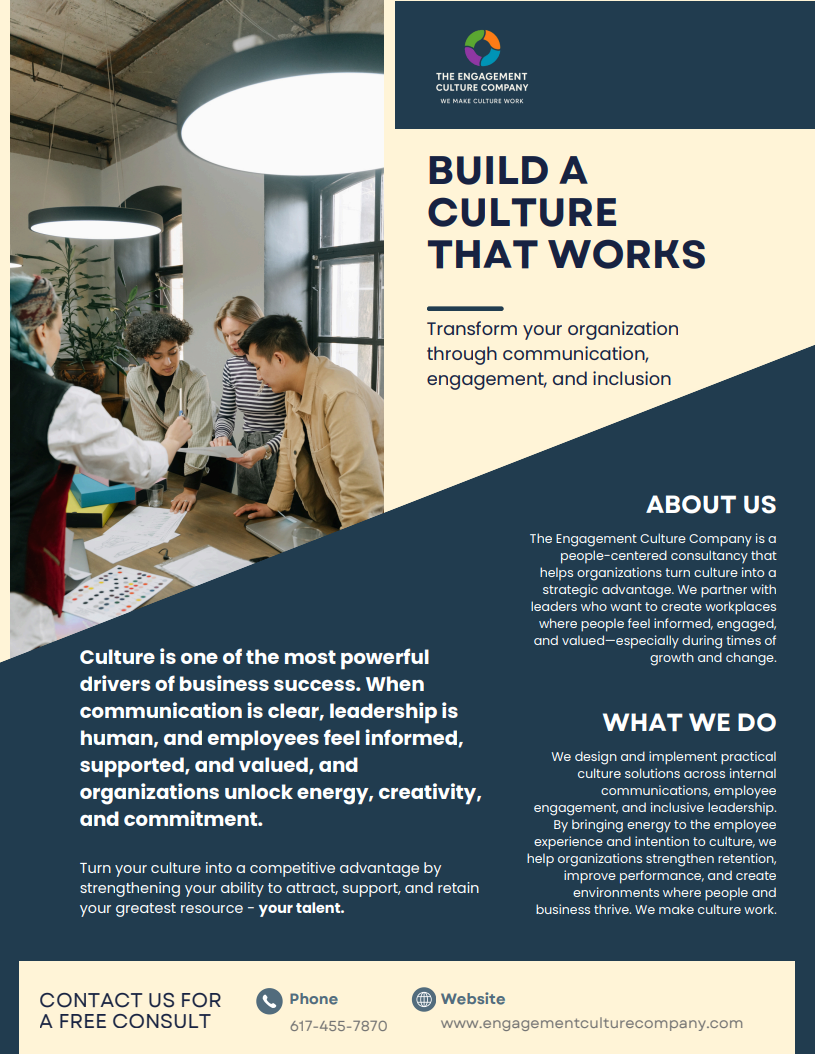 I founded The Engagement Culture Company out of a deep passion for creating cultures that genuinely support people. I help leaders move beyond intention to action by embedding communication, engagement, and inclusive practices into everyday operations, so employees feel informed, supported, and valued. When people feel connected to their work, trusted by their leaders, and included in the path forward, organizations are better positioned to retain great talent and achieve meaningful, lasting results.